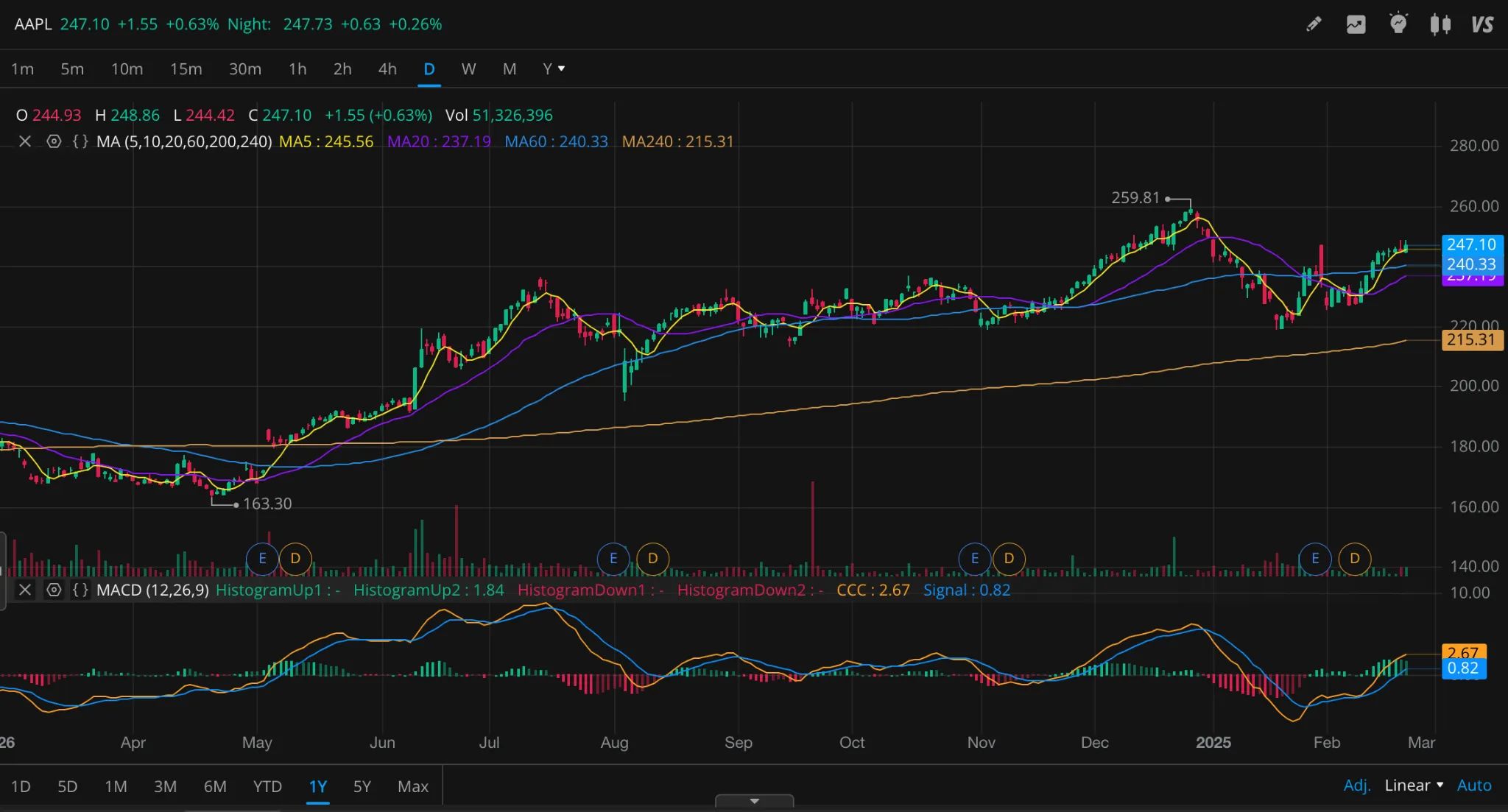 또한, Apple의 주가 추이를 살펴보면, 2025년 2월 21일 기준 주가는 $245.55로, 전일 대비 소폭 하락하였습니다.