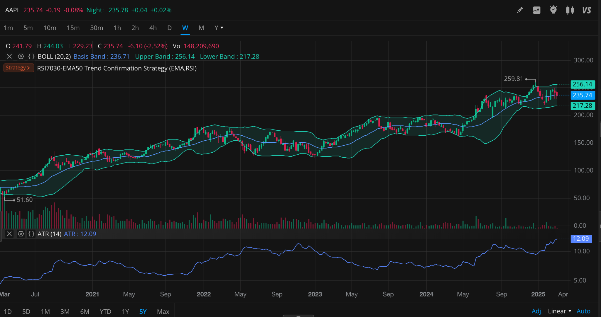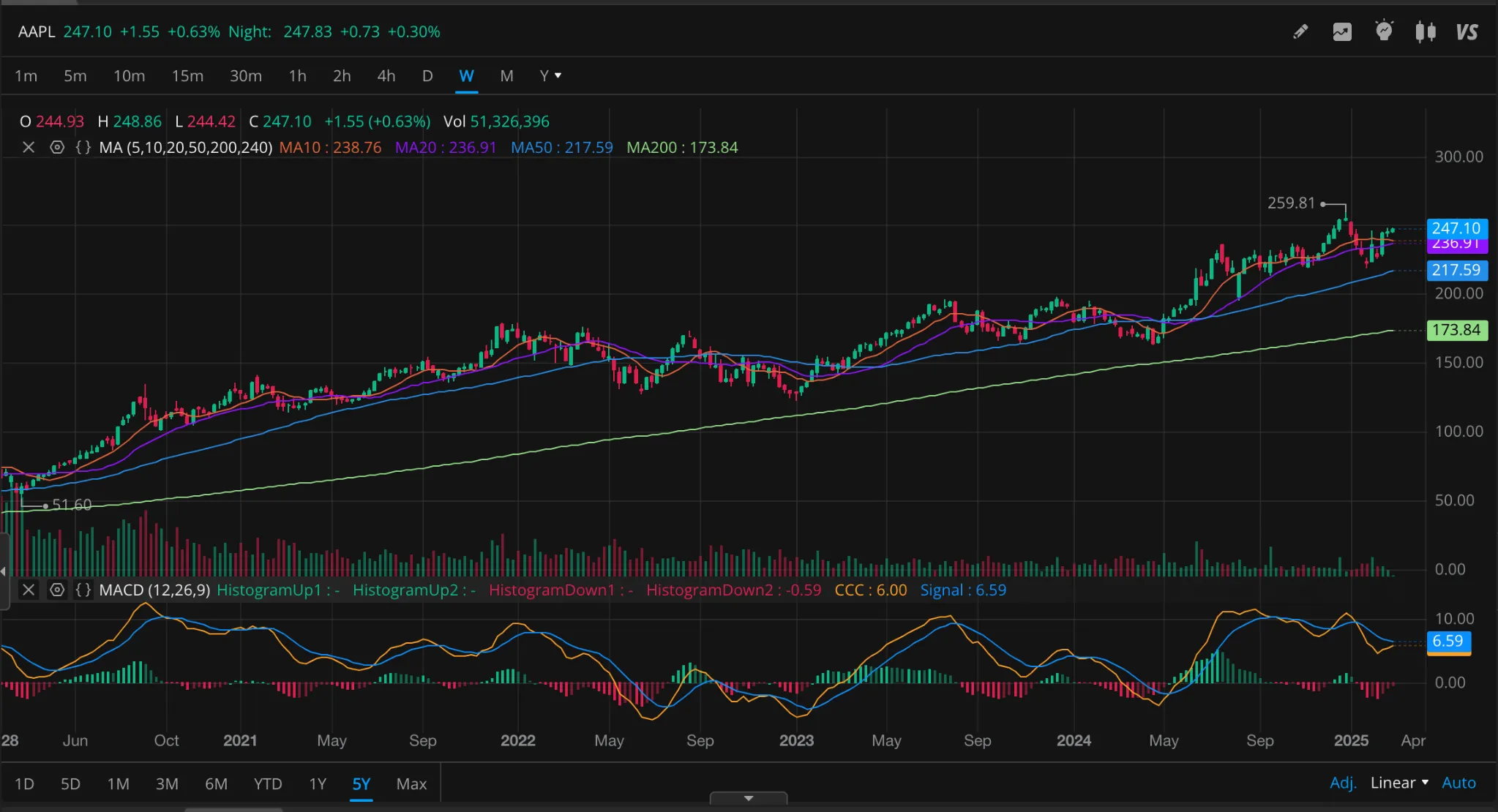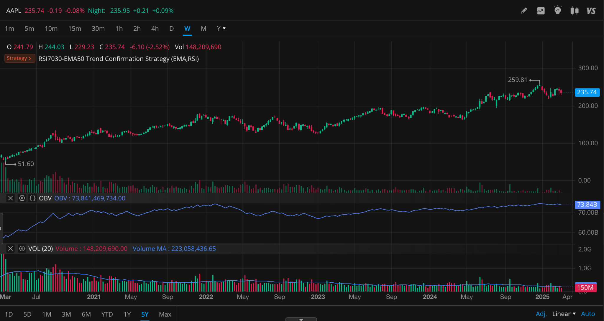- 주간 거래량이 200M 이상 증가하면서 주가가 250달러 이상 상승하면 추가 상승 가능