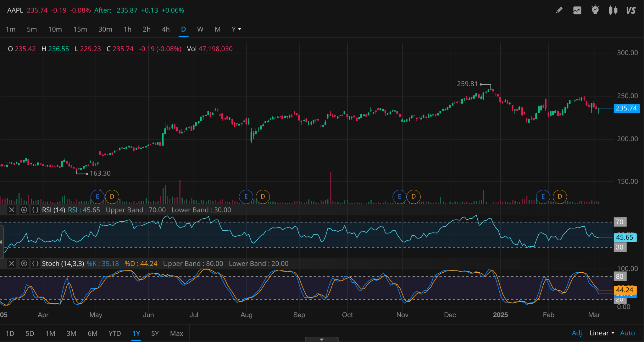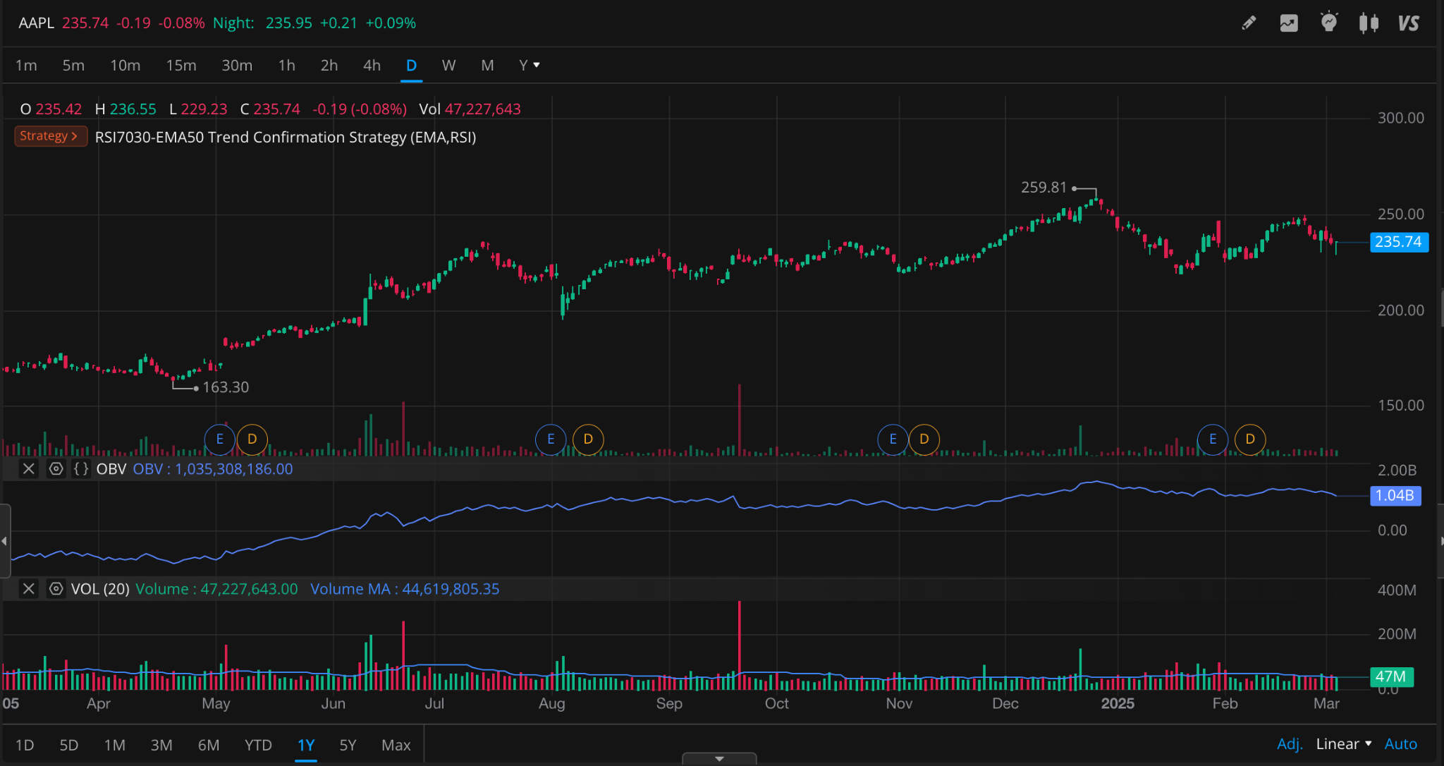 - 주가가 259.81 고점을 찍고 조정을 받는 동안 OBV가 하락하지 않은 것은 매수세가 여전히 살아있음을 의미