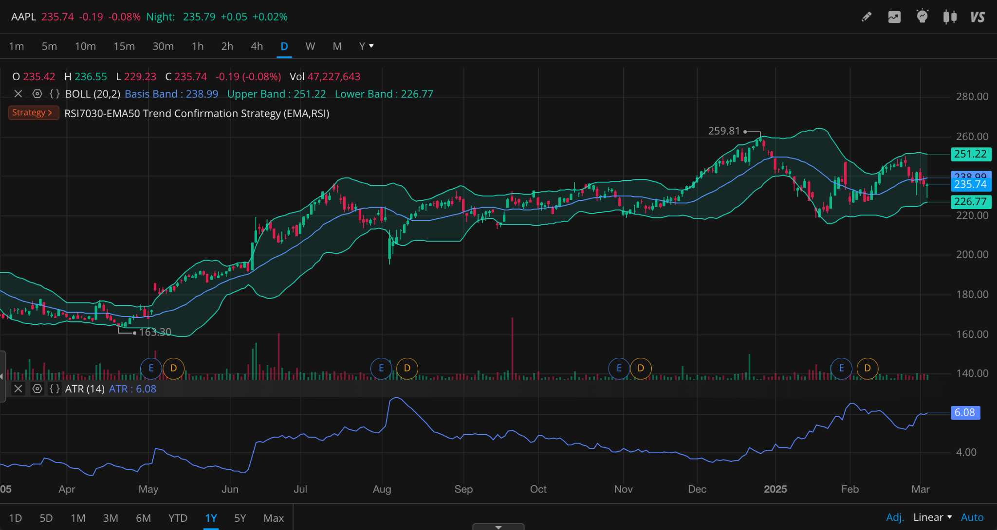 - 볼린저 밴드 중심선(236.71) 근처에서 반등하면 장기 매수 고려